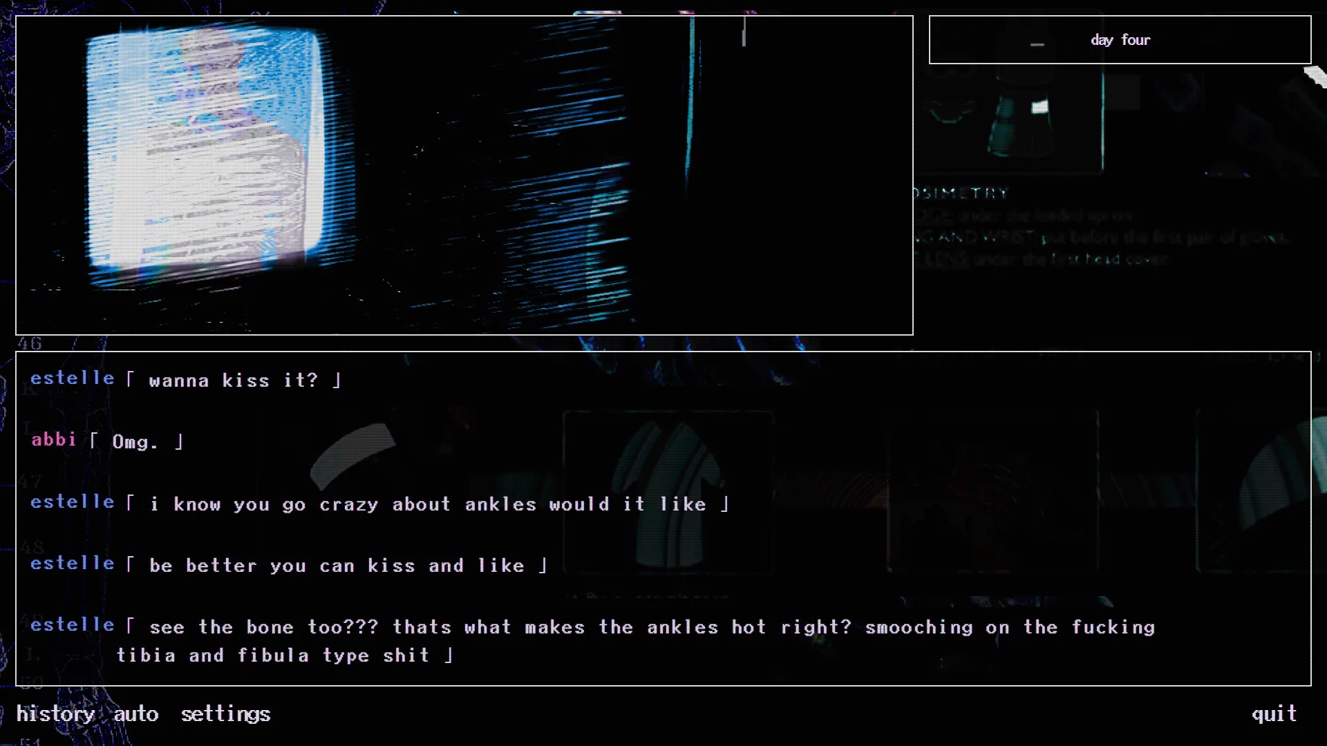 With no known cure for a Host infected by Miasma, Estelle spends the remainder of her days exchanging messages with her closest coworker, Abbi. Together, they do their best to feel intimacy by being perverts together while staring the looming, macabre regression toward death straight in the eye.